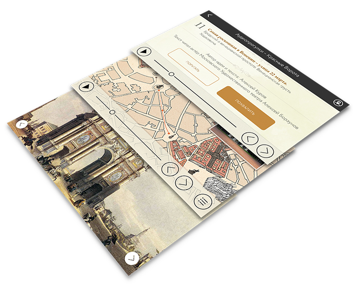 From competitors this project distinguishes unique content: maps drawn watercolor by professional artist and the texts of walk read honored artists of Russia.