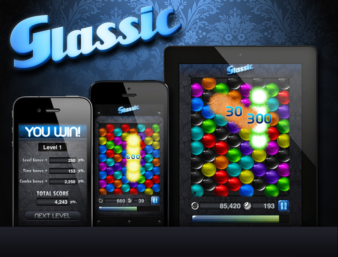 Popular three-in-a row game with realistically exploding glass balls and chillout music. Developed with Cocos2d technology.