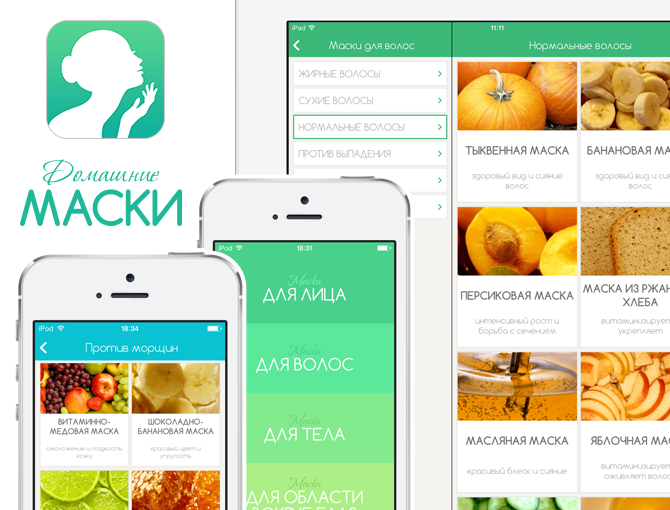 "Home-made masks" - "Beauty and health recipes" were repeatedly placed by Apple in "Best new apps" category and also in "Best apps for Women's Day" category. It contains over 300 mask recipes in an easy and structured way. All interactions and state-transitions contain unique animations.